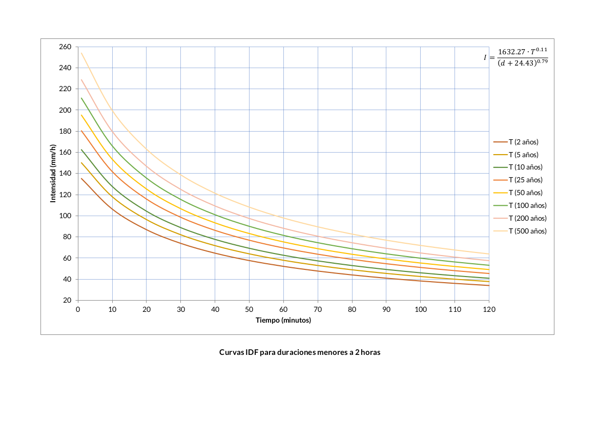 Se determinó la ecuación de las curvas IDF por el método dado por Sherman pudiéndose verificar que la intensidad de precipitación decrece cuando aumenta la duración y para una misma duración, la intensidad aumenta con el periodo de retorno. Por otro lado, las intensidades menores e iguales a 10 minutos superan los 100 mm/h para todas las recurrencias.